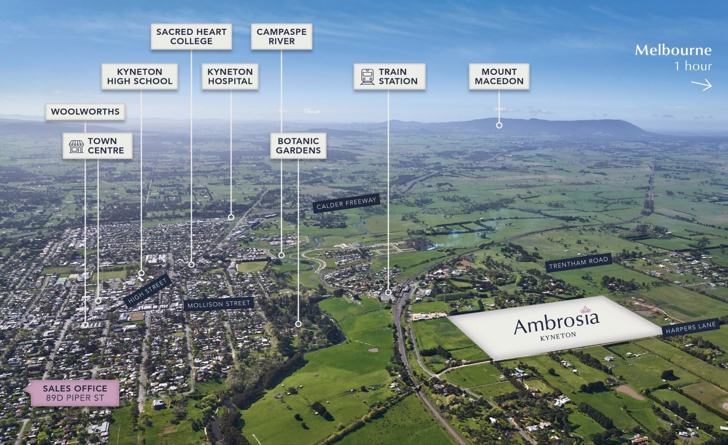Ambrosia is an exclusive development of just 65 large lots (2,000m²–7,856m²) in the scenic township of Kyneton, nestled in the Macedon Ranges—less than an hour from Melbourne. Located on Harpers Lane and within walking distance to Kyneton Train Station, these premium lots are framed by feature white post-and-rail fencing and a beautifully landscaped wetland reserve at the entrance. Sherridon Homes offers exclusive house and land packages at Ambrosia Estate, combining spacious lots with smart, flexible home designs for comfort and value. Located in Kyneton’s beautiful Macedon Ranges, this boutique development features only 65 lots over 2,000m². Enjoy up to $55,000* in savings on select packages for a limited time.