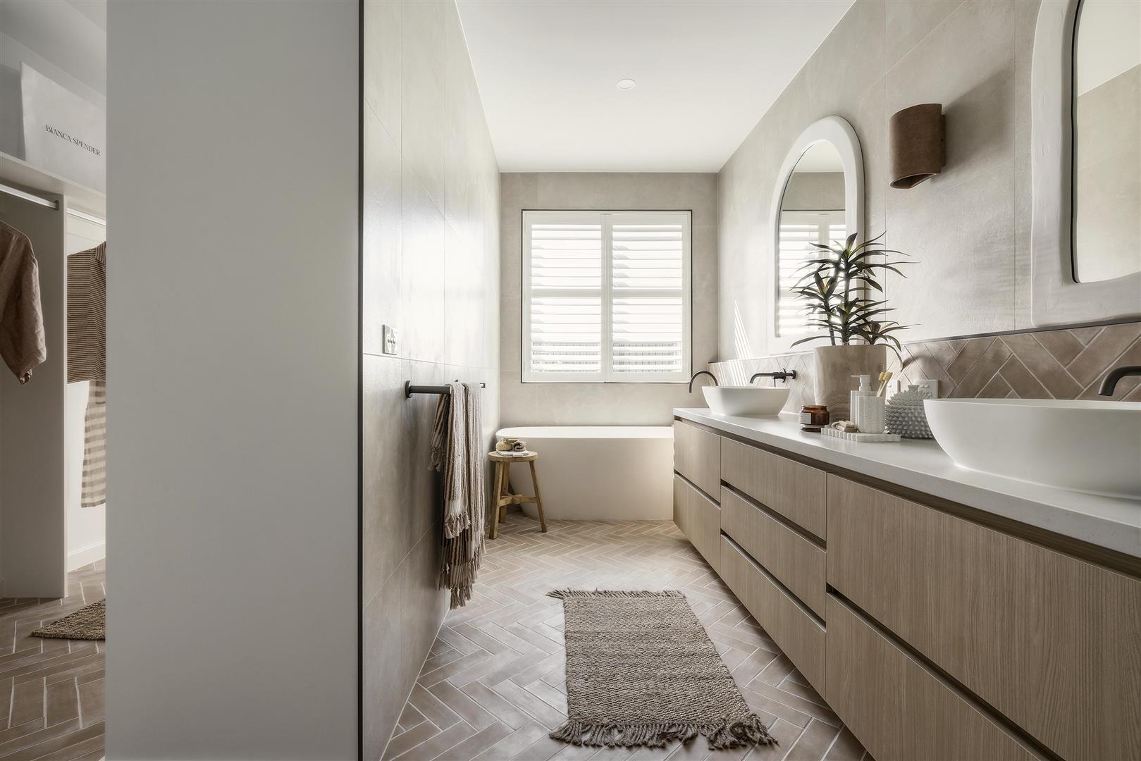 The master suite in the Elmont 32 is designed to be a true sanctuary for parents. Located at the rear of the home for maximum privacy and tranquillity, this spacious retreat features a luxurious ensuite with double vanities, cast stone solid finish basins, and a contemporary bathtub. The Mediterranean-inspired design, complete with herringbone-laid matt terracotta tiles, creates a serene and sophisticated atmosphere where parents can unwind.