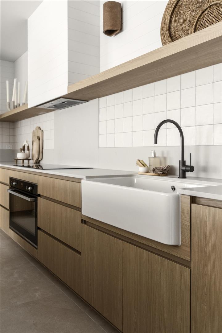 At the heart of the Elmont 32 display home is its expansive kitchen, the perfect space for meals and gatherings. The kitchen boasts an aged ash finish island bench, complemented by a Caesarstone benchtop and splashback tiles in a concrete finish. Sleek gun metal finish tapware adds a striking contrast to the understated colour palette, creating a modern and chic cooking space that’s sure to inspire your inner Masterchef.