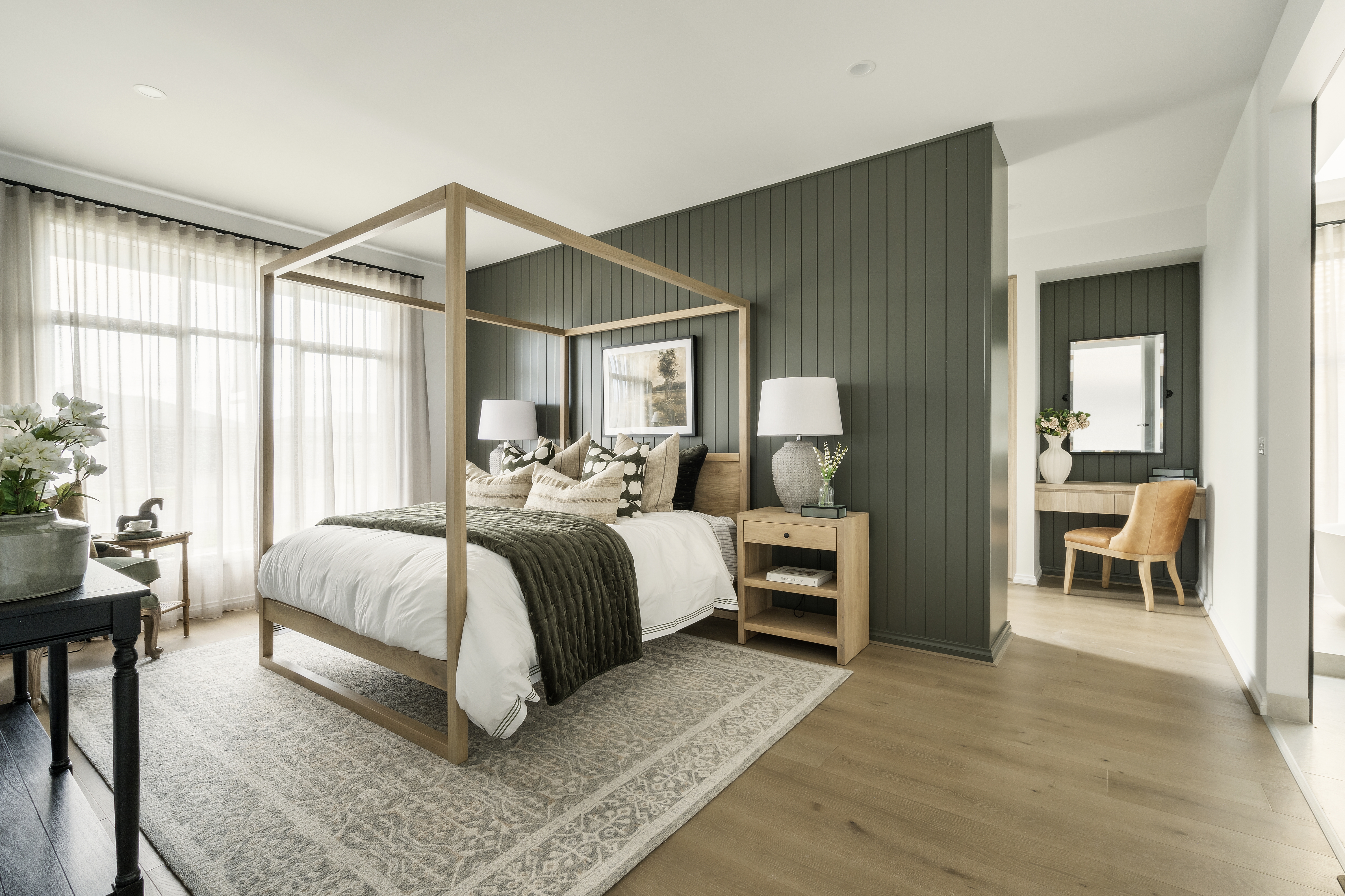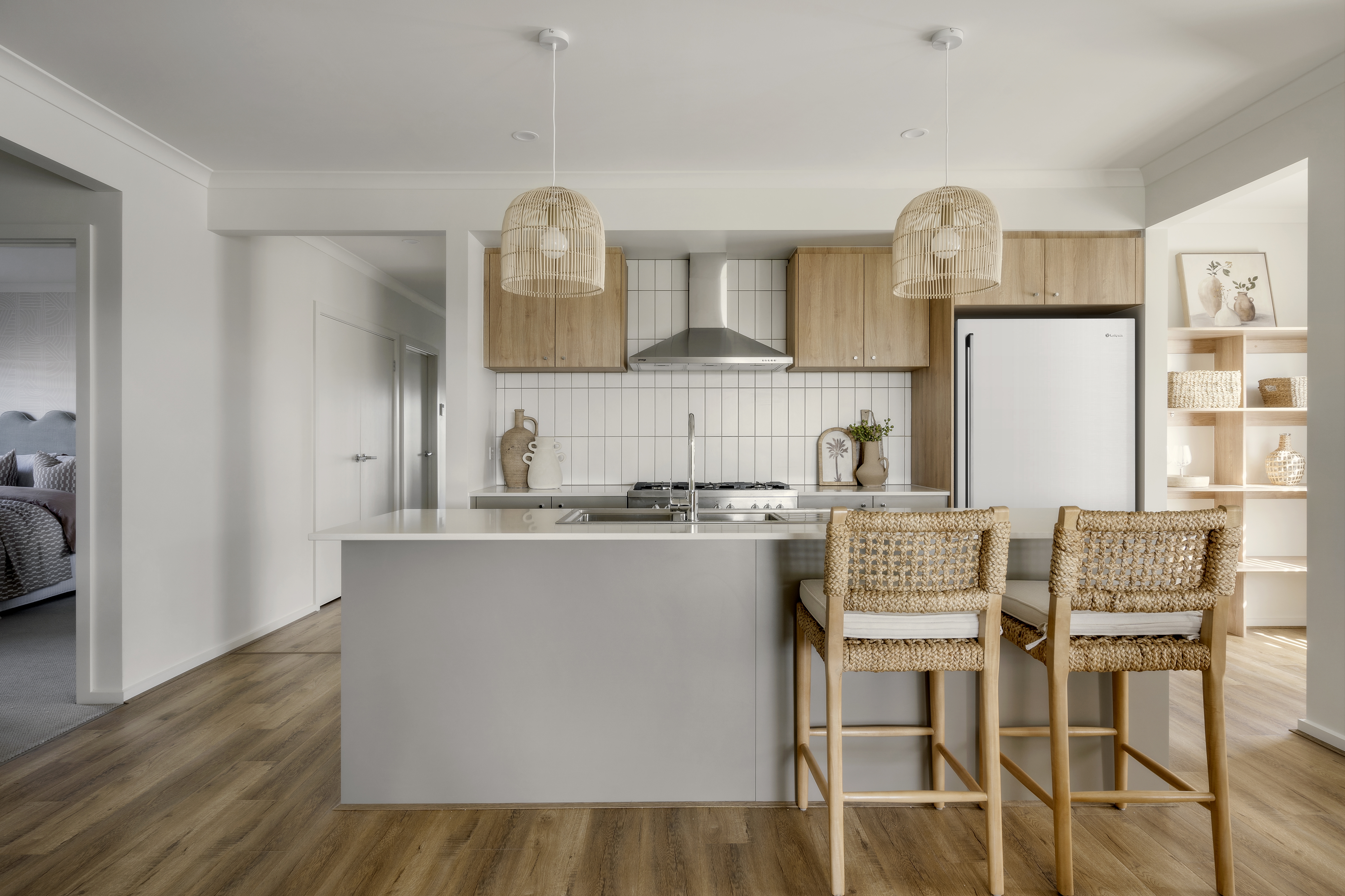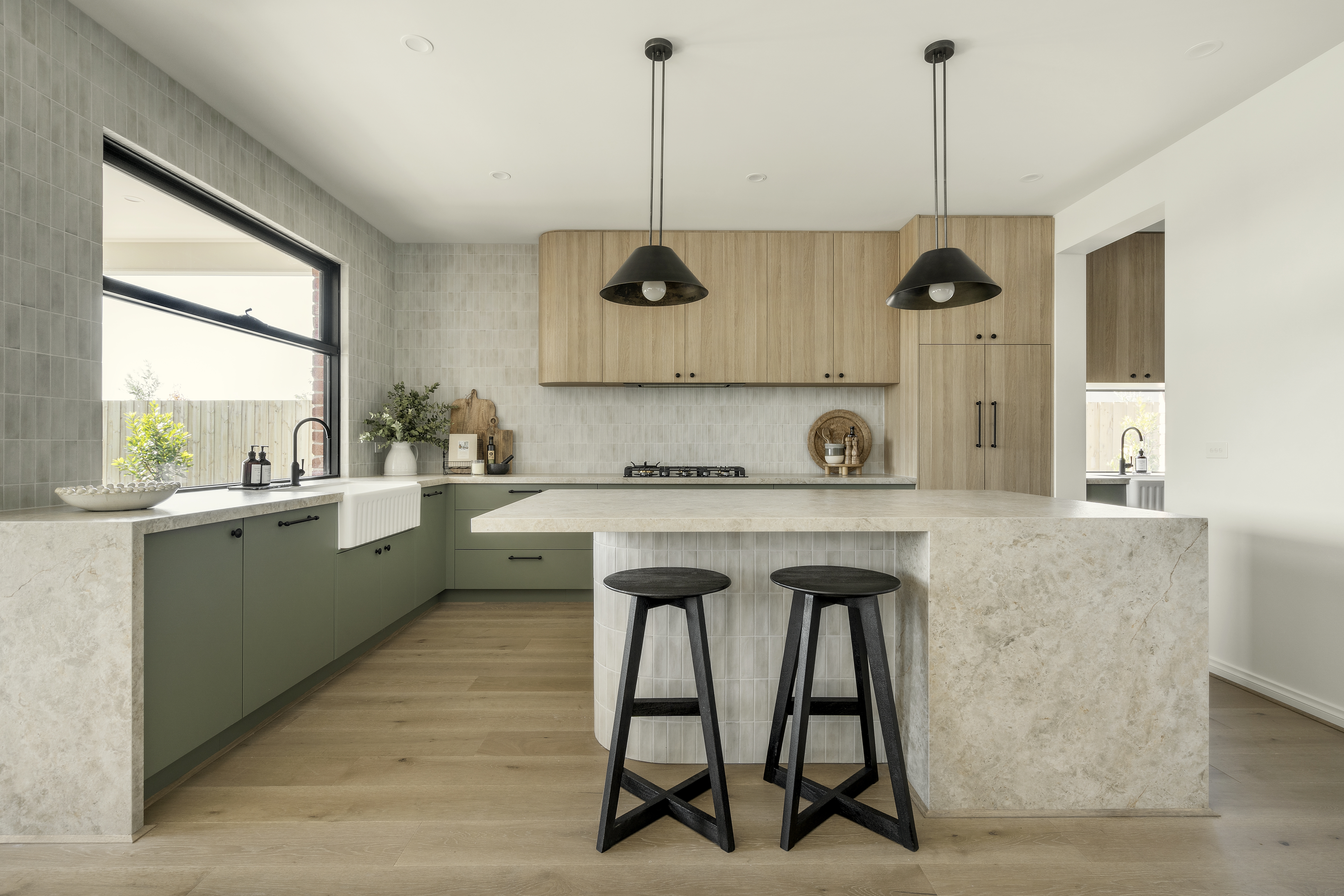 The kitchen combines elegance and function with Caesarstone Mosstone benchtops, a fluted Fienza Olivia Butler Sink (large in the main kitchen and small in the butler’s pantry), textured Denia Moka splashback tiles, an Omega 90cm gas on glass cooktop and an integrated Fisher & Paykel fridge. Bathrooms elevate everyday luxury with frameless shower screens, Spanish Olive feature tiles, floating oak vanities and Caesarstone benchtops.
