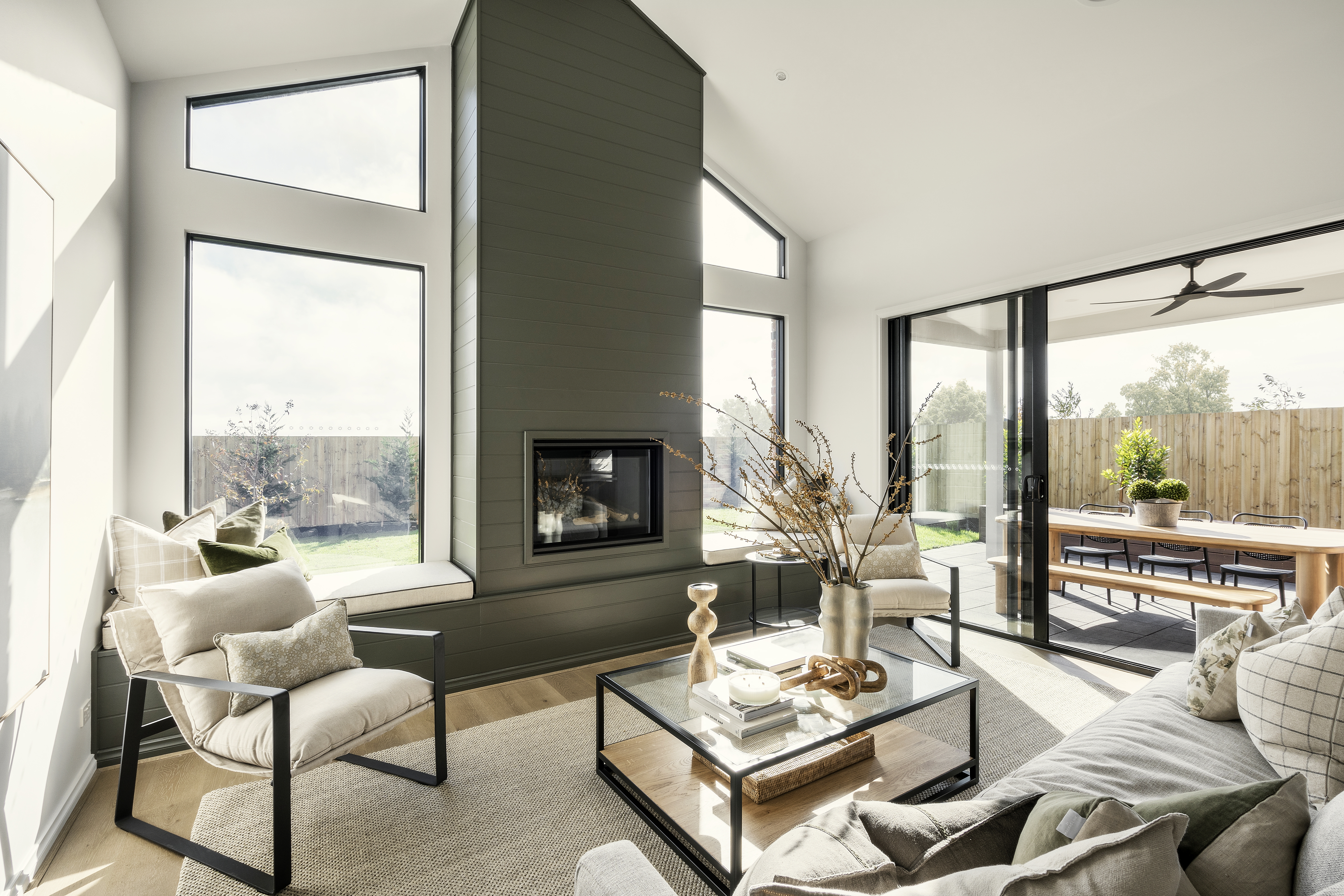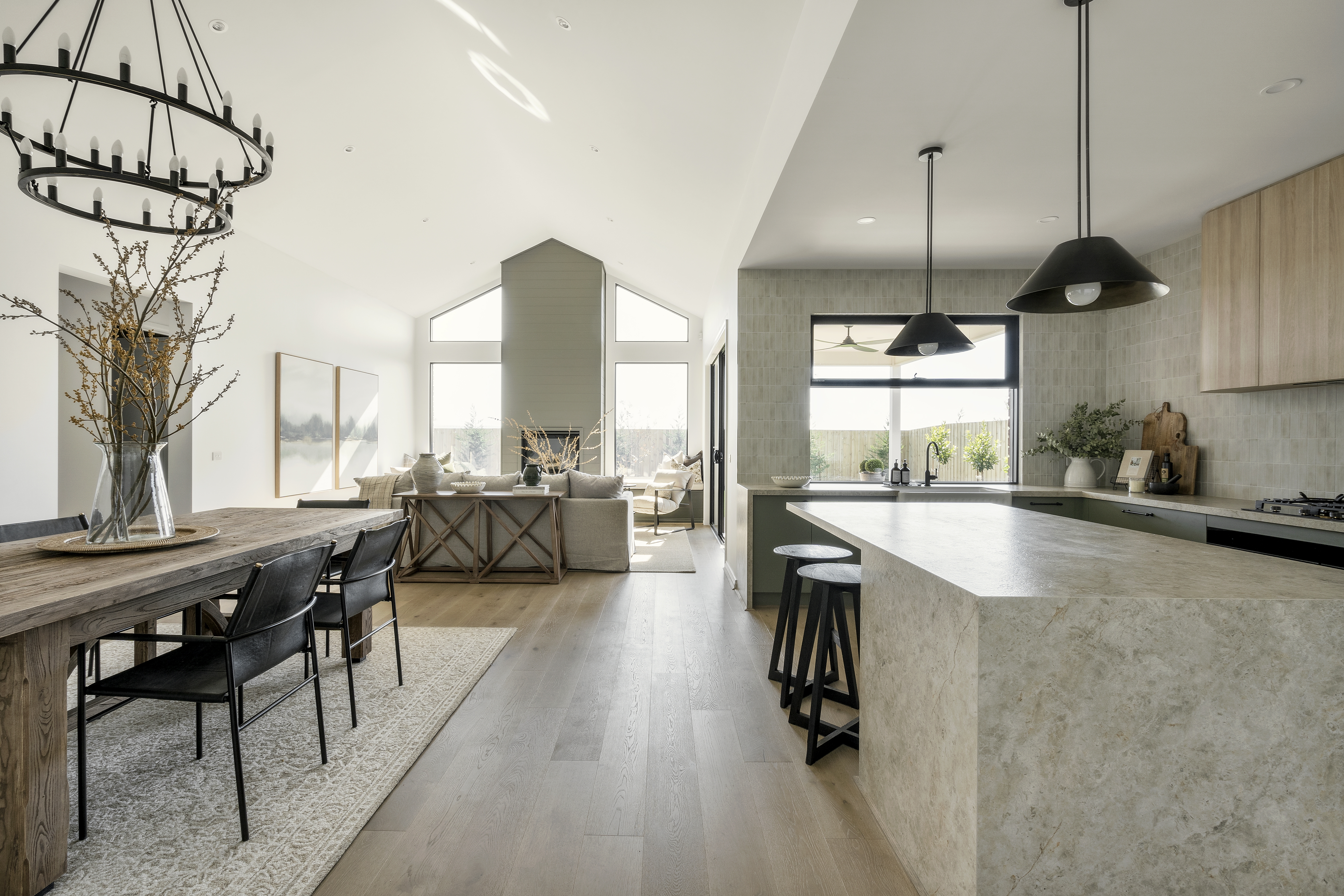 The master suite is a true sanctuary with two walk-in robes and a beautifully appointed ensuite, while the heart of the home is the expansive kitchen complete with a large walk-in pantry, perfect for both everyday meals and entertaining guests. Cathedral-style ceilings with highlight windows create a light-filled haven, complemented by engineered Grey Ash timber flooring and a Real Flame Vektor fireplace with James Hardie Axon cladding as the living room centrepiece.